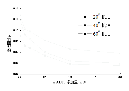 将WADTP添加剂分别按0.1wt%、0.2wt%、0.5wt%、1.0wt%和2.0wt%的比例添加到市售的20#、40#和60#机油中,测定其摩擦因数μ值的变化,结果见图2。