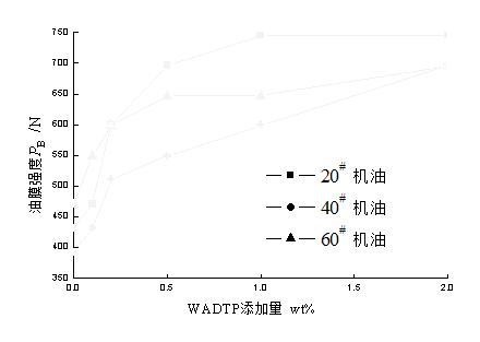 将WADTP添加剂分别按0.1wt%、0.2wt%、0.5wt%、1.0wt%和2.0wt%的比例添加到市售的20#、40#和60#机油中,测定其油膜强度PB值的变化,结果见图1。