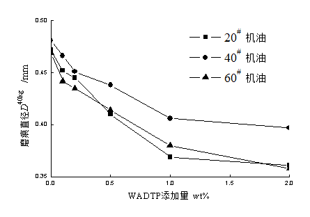 将WADTP添加剂分别按0.1wt%、0.2wt%、0.5wt%、1.0wt%和2.0wt%的比例添加到市售的20#、40#和60#机械油中,测量磨痕直径D40kg,结果见图3。