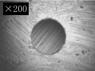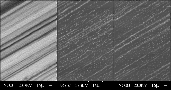 图4给出了在上面的试验后利用XJP-6A金相显微镜拍摄的添加了1.0wt%WADTP的40#机油润滑下钢球表面磨斑,图5为利用Elementar Vario E1元素分析仪得到的磨斑形貌和与其对应的表面元素S、P的分布图,其中白色斑点代表该元素在磨斑表面的分布。从图中可以看出,白色斑点在磨斑表面分布较密,而且分布规律与磨痕方向相对应,这说明S、P元素集中分布于磨损处填平磨痕表面,并作为主要元素参与了摩擦化学反应膜的形成。